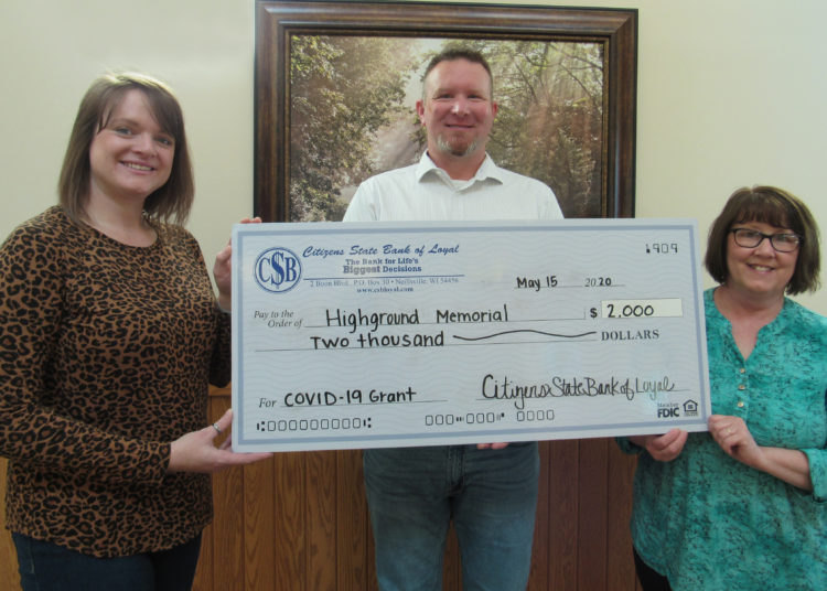 Leah Wilson and Darlene Zschernitz of Neillsville Citizens State Bank of Loyal presented a check for $2,000 to Chris Pettis, Executive Director at The Highground. “We hope that this small contribution will help to offset the difficulties that COVID-19 has had on their operational budget,” stated President & CEO Travis J. Holt.